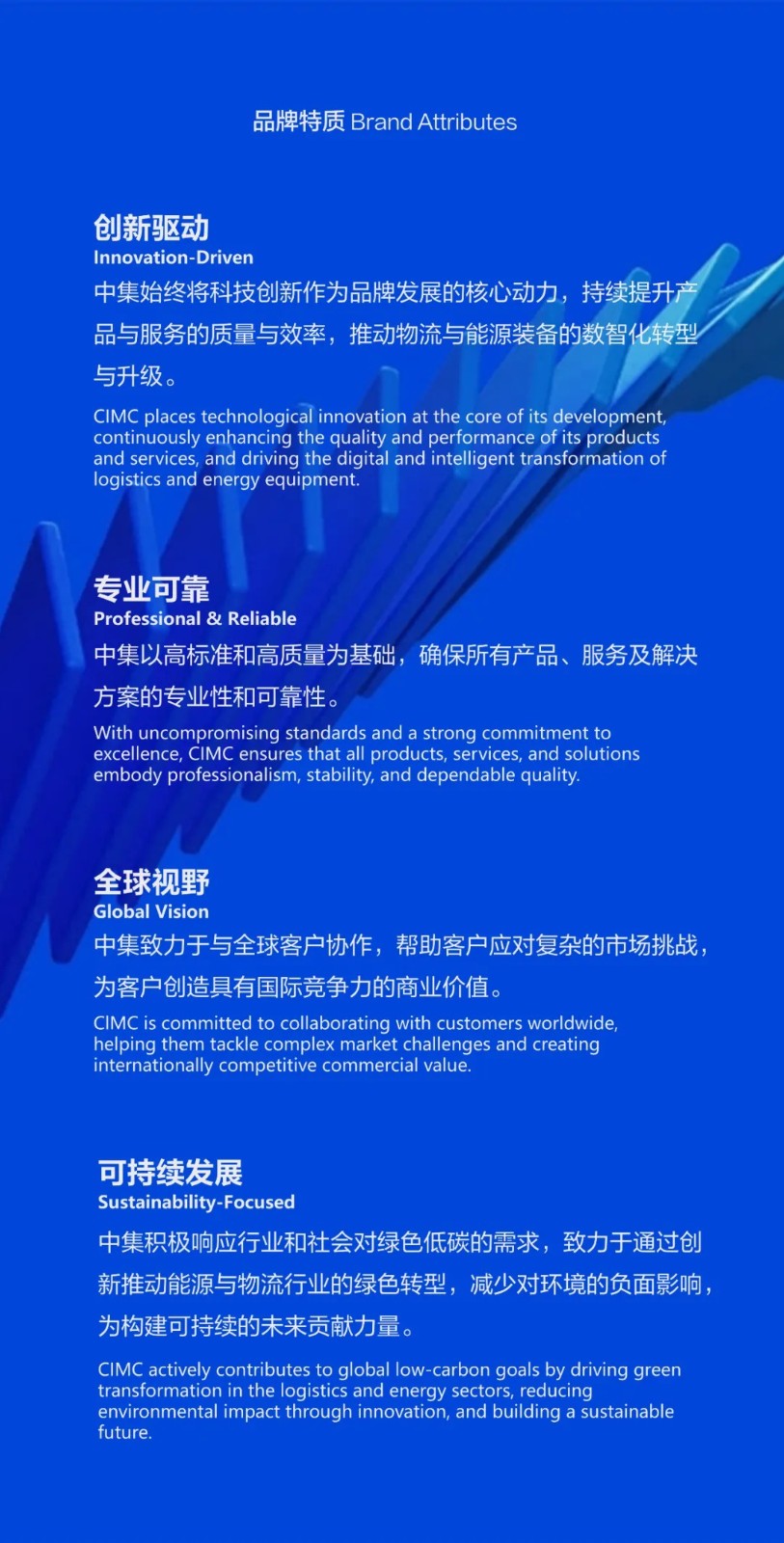 ?品牌使命:中集致力于以科技創新,為全球客戶提供高品質的先進裝備、服務及解決方案,推動物流與能源行業的可持續發展,為人類創造更美好的生活。